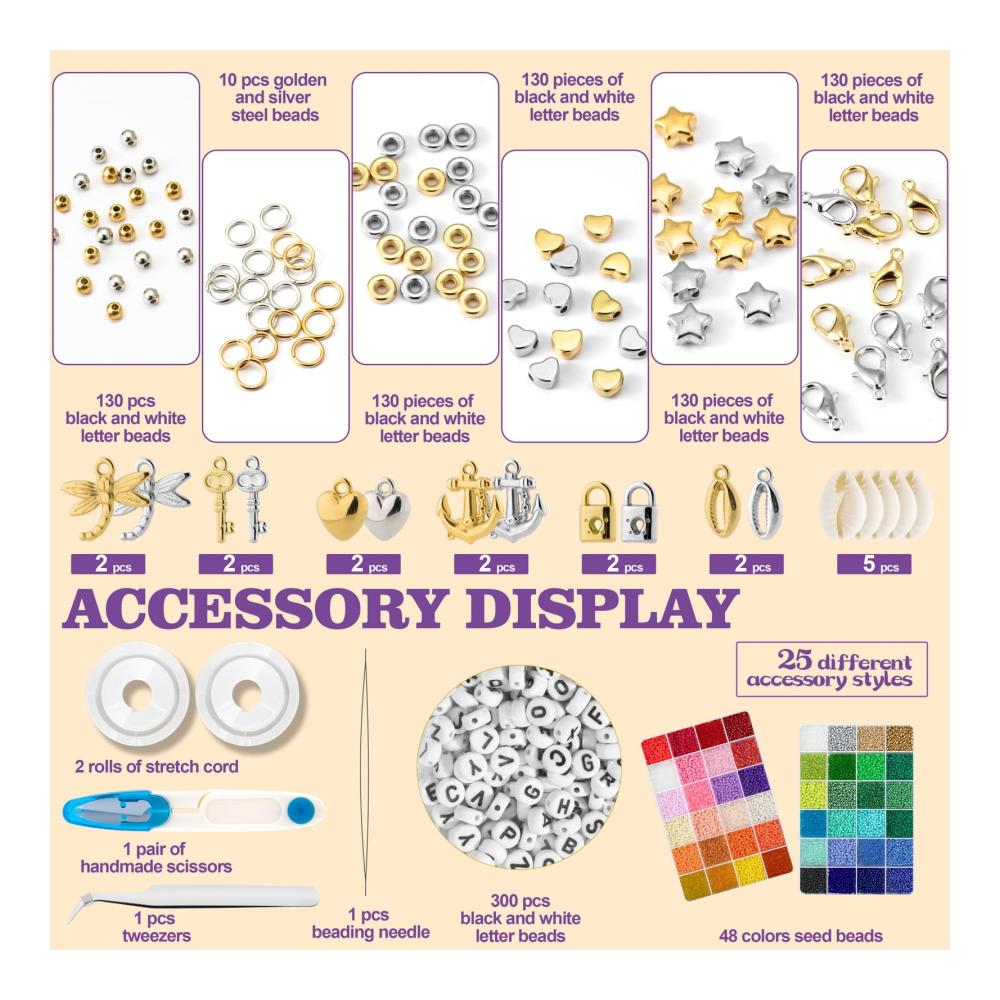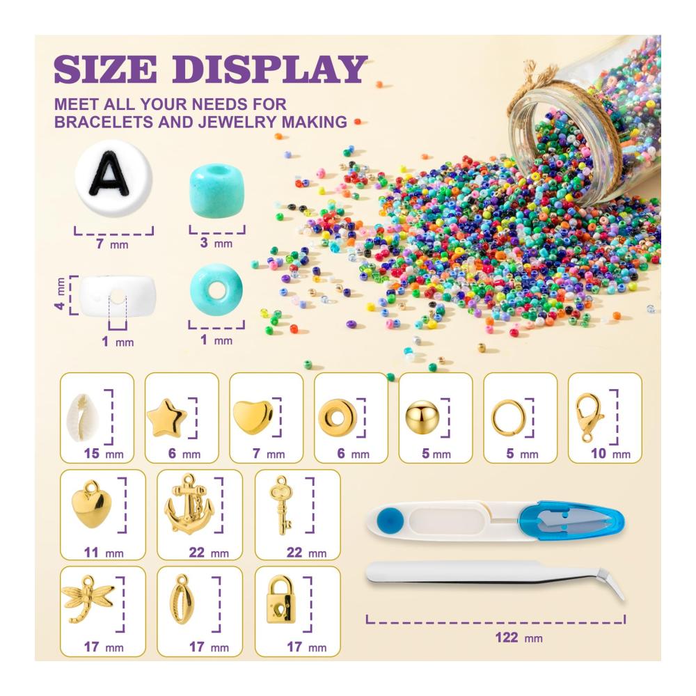 • Schmuck selber machen Set: 16.000 Glasperlen mit einem Durchmesser von 3 Millimetern; 300 Buchstaben. 2 Rollen mit 0,5 cm Schnur, 1 Schere, 1 Pinzette, 1 Perlenauffädelwerkzeug, 38 goldene Metallanhänger, 38 silberne Anhänger, 5 Muschelanhänger, 10 Hummerbroschen, 20 offene Ringe.