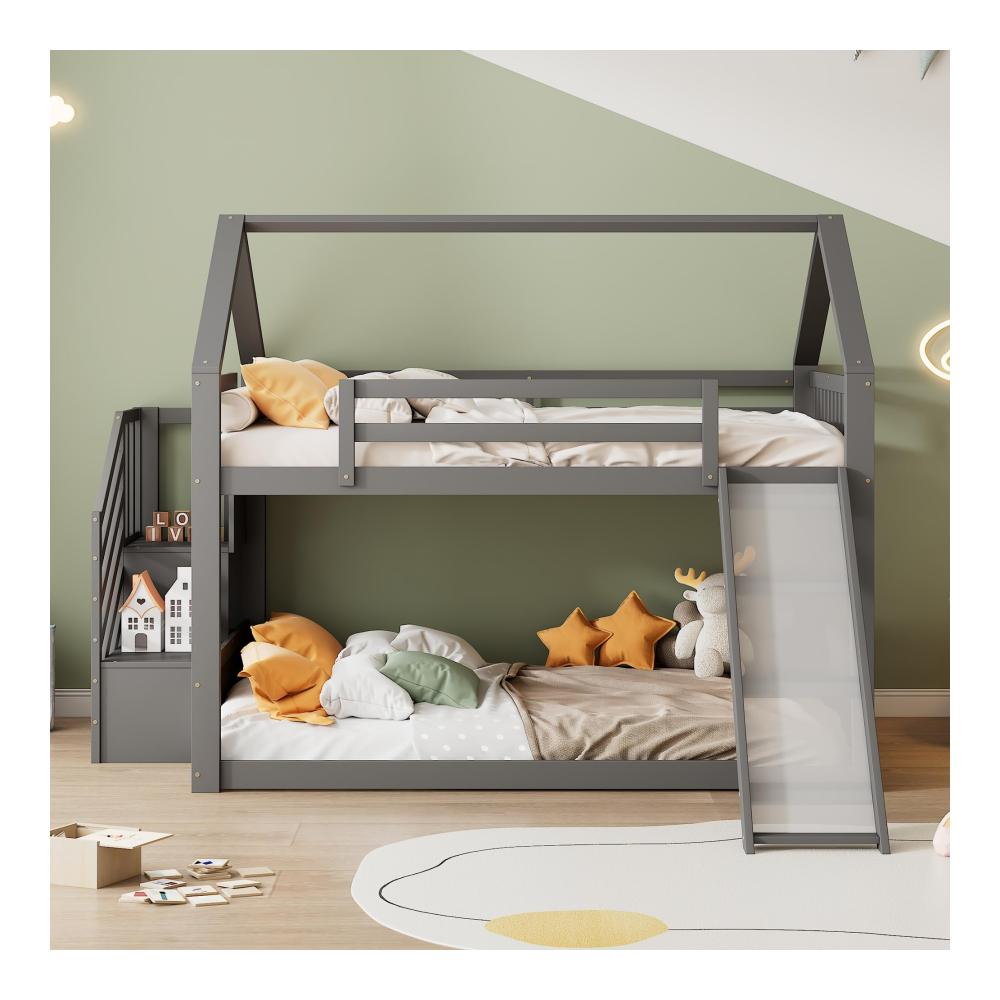 Creative House Bed Frame: Dieses Etagenbett hat eine skurrile Hausform mit einer Rutsche und Aufbewahrungstreppe. Die Position der Rutsche kann nach Belieben verändert werden. Gemeinsam mit Ihrem Kind können Sie den Bettrahmen mit Bändern, Zelten oder Laternen an der Dachtraufe verzieren. Das Design dieses Hausbettes hat eine einfache Silhouette und elegante Farbtöne. Es passt zu allen Einrichtungsstilen und vervollständigt den Look eines jeden Schlafzimmers.